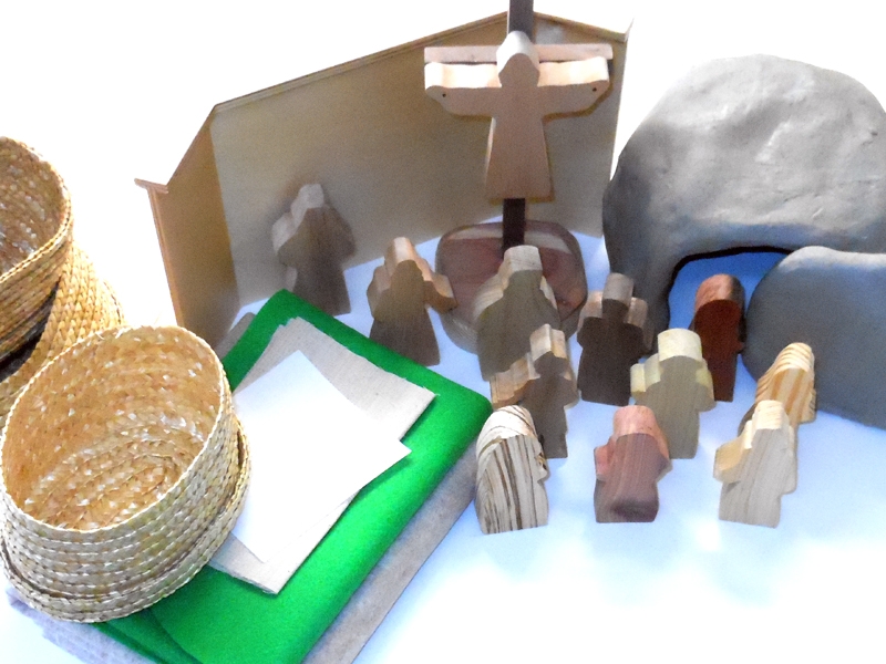 Jesus Dies & God Makes Jesus Alive is a wooden Godly resources Bible story for Sunday school lessons, children’s Bible study, & religious education. Jesus Dies & God Makes Jesus Alive is the story of Jesus’ death and resurrection. Set includes 11 multi-wood figures/box, small backdrop, resin tomb, cross with Jesus figure, and felt underlay. Mark 15.
